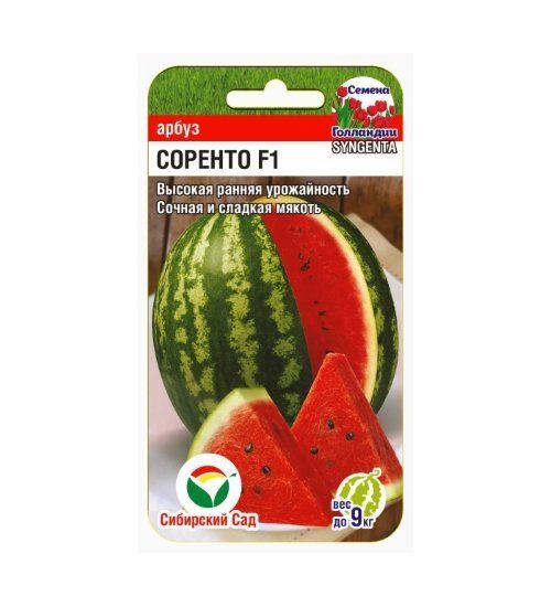 Ранний высокоурожайный, Сочная и сладкая мякоть. Растение среднеплетистое, формирует по 2-3 плода одновременно, масса которых в зрелом виде доходит до 9 кг. Плод округлой формы, темно-зеленого цвета со светлыми полосами. Оттенок мякоти варьируется от светло-красного до бордового. Содержание сахара в плодах высокое. Семена мелкие.