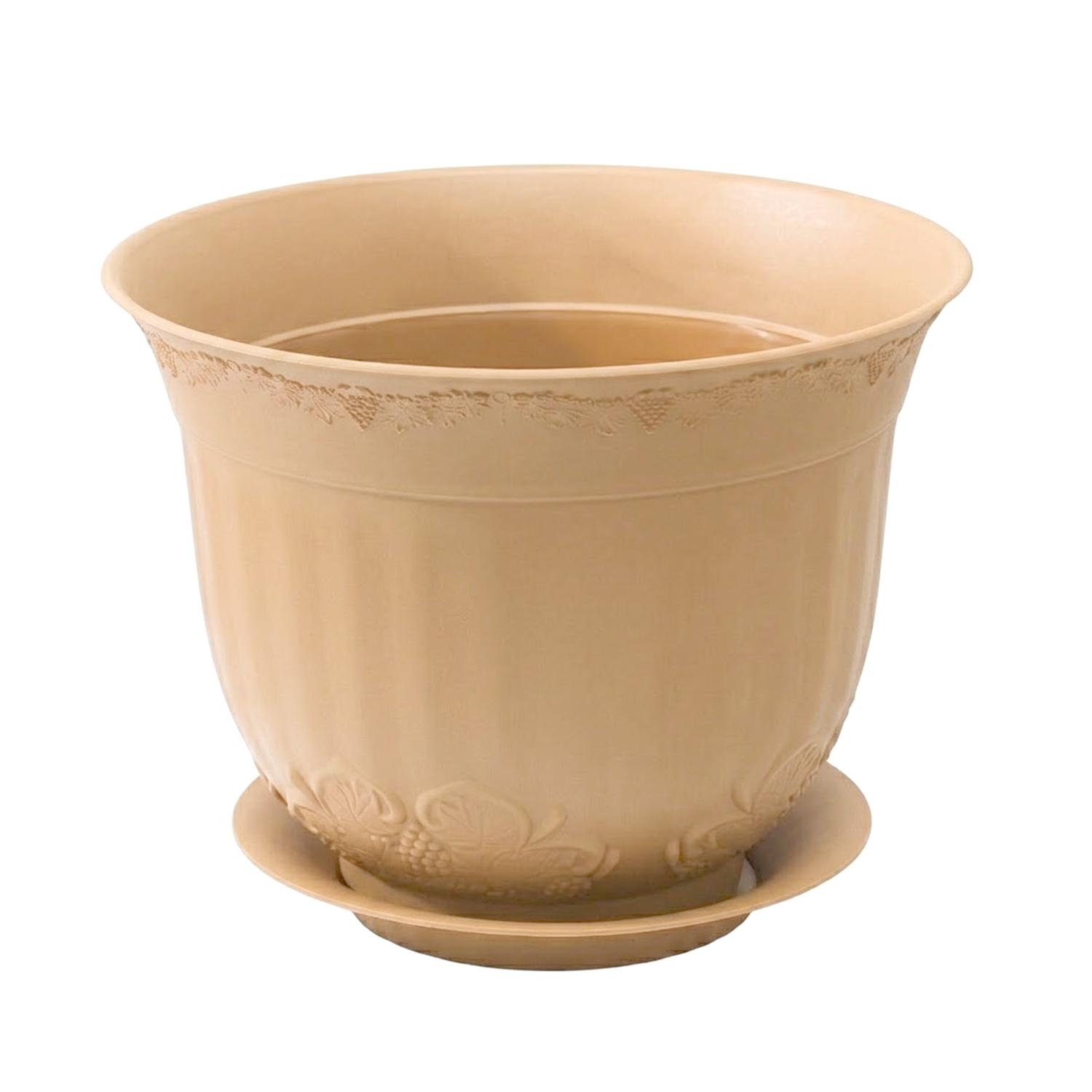 Выразительное кашпо Ангара с рельефным орнаментом дополнено практичным поддоном. Модель классической формы, расширяющейся кверху, обладает универсальным объемом 2,5 литра. Такое решение отлично подходит для выращивания комнатных растений среднего размера, например, спатифиллумов или пеларгоний, на подоконниках в интерьере дома.