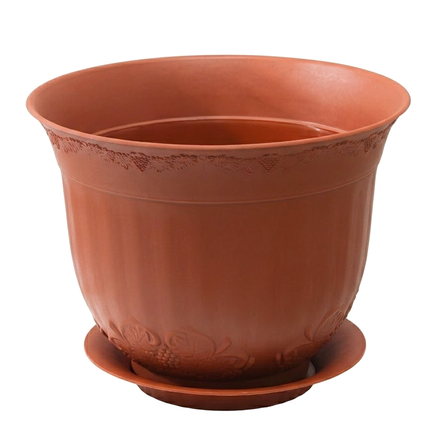 Выразительное кашпо Ангара с рельефным орнаментом дополнено практичным поддоном. Модель классической формы, расширяющейся кверху, обладает средним объемом 4,5 литра. Такой размер оптимален для выращивания комнатных растений, например, молодых монстер, создавая эстетичный акцент в интерьере дома.