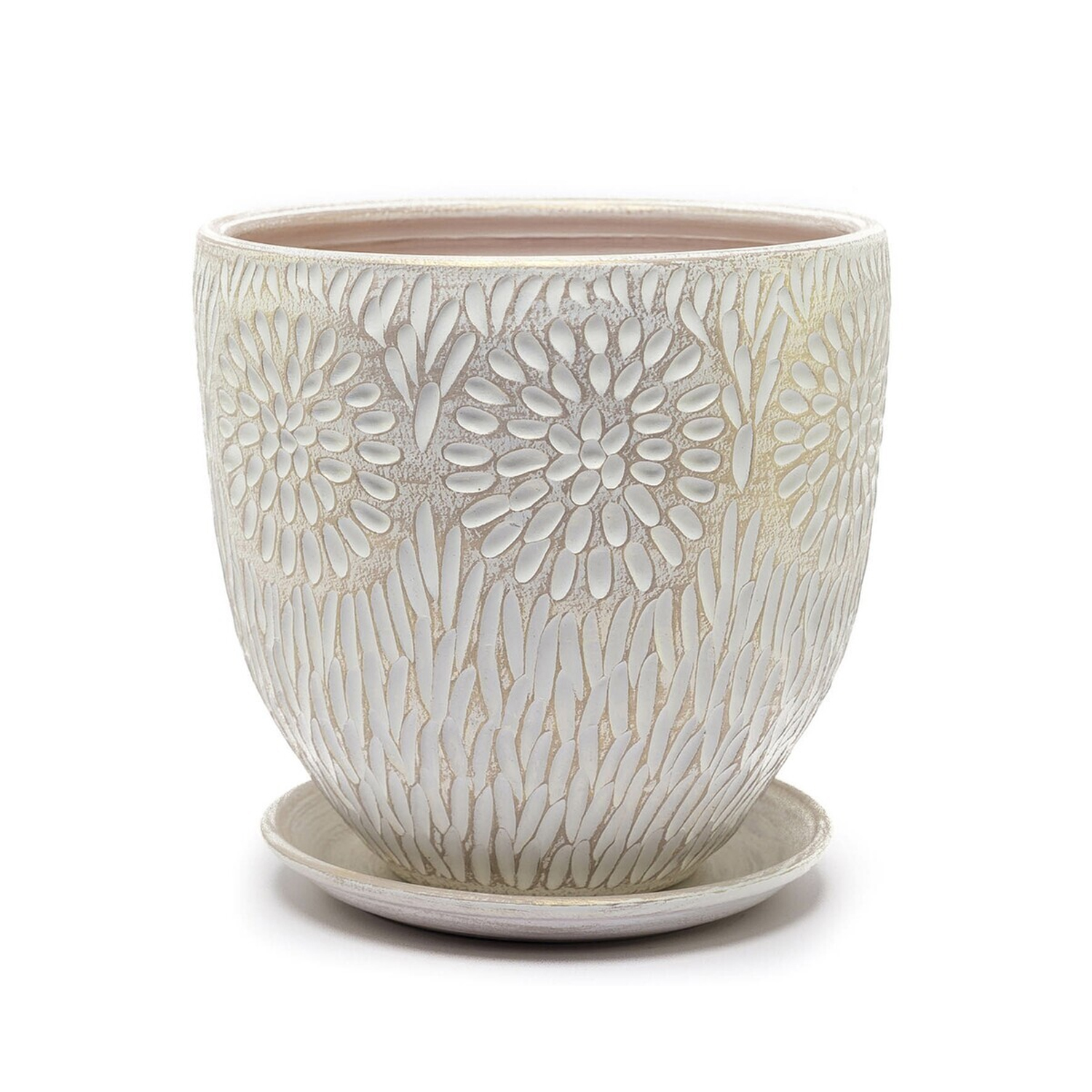 Кашпо выполнено из керамики с рельефным орнаментом в виде лепестков. Кашпо создает мягкий акцент в интерьере и подходит для размещения в современных и классических интерьерах. Кашпо укомплектовано поддоном, это делает его удобным для посадки комнатных растений среднего размера.