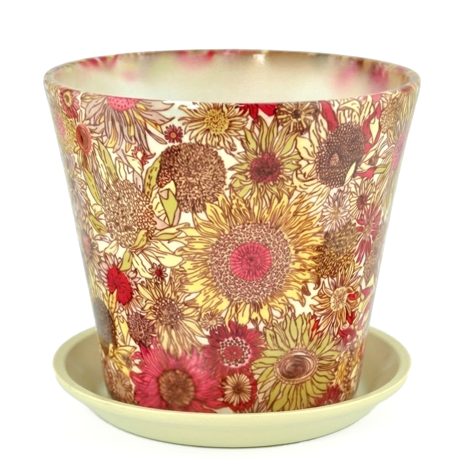 Кашпо оформлено в ярком флористическом дизайне. Подходит для оформления жилых и офисных пространств. Кашпо изготовлено из керамики и укомплектовано поддоном. Аккуратно вписывается в современные интерьеры и помогает подчеркнуть красоту растений.