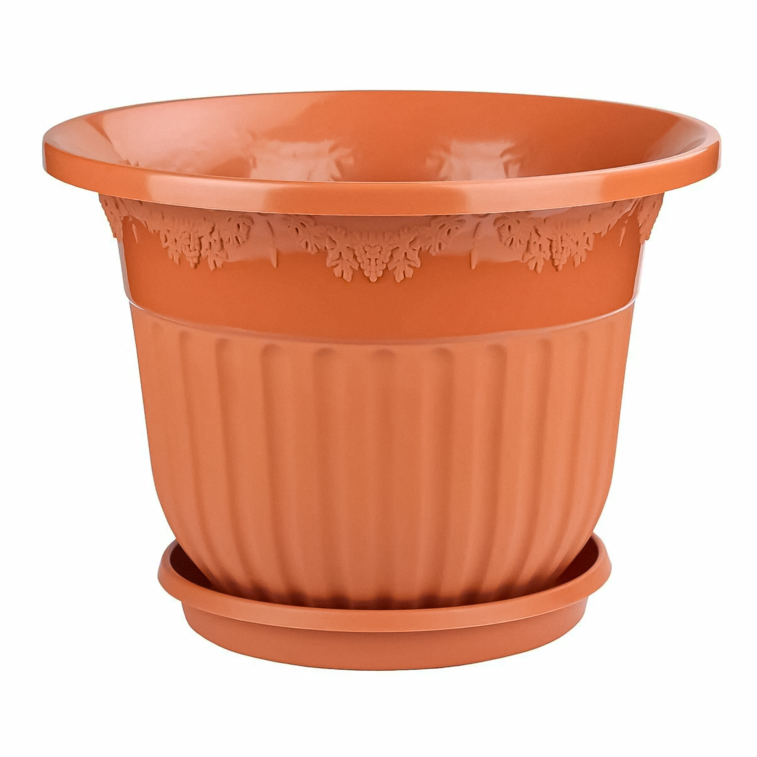 Вместительное кашпо с округлой формой и выразительным декоративным оформлением. Верх украшен рельефным орнаментом, а нижняя часть дополнена вертикальными ребрами, которые придают поверхности фактурность и делают силуэт более выразительным. Широкий бортик подчёркивает форму и делает изделие аккуратным на вид. Большой объём подходит для крупных комнатных растений, декоративных кустарников или цветочных композиций. Поддон помогает аккуратно разместить кашпо в доме, на балконе или в зоне отдыха.