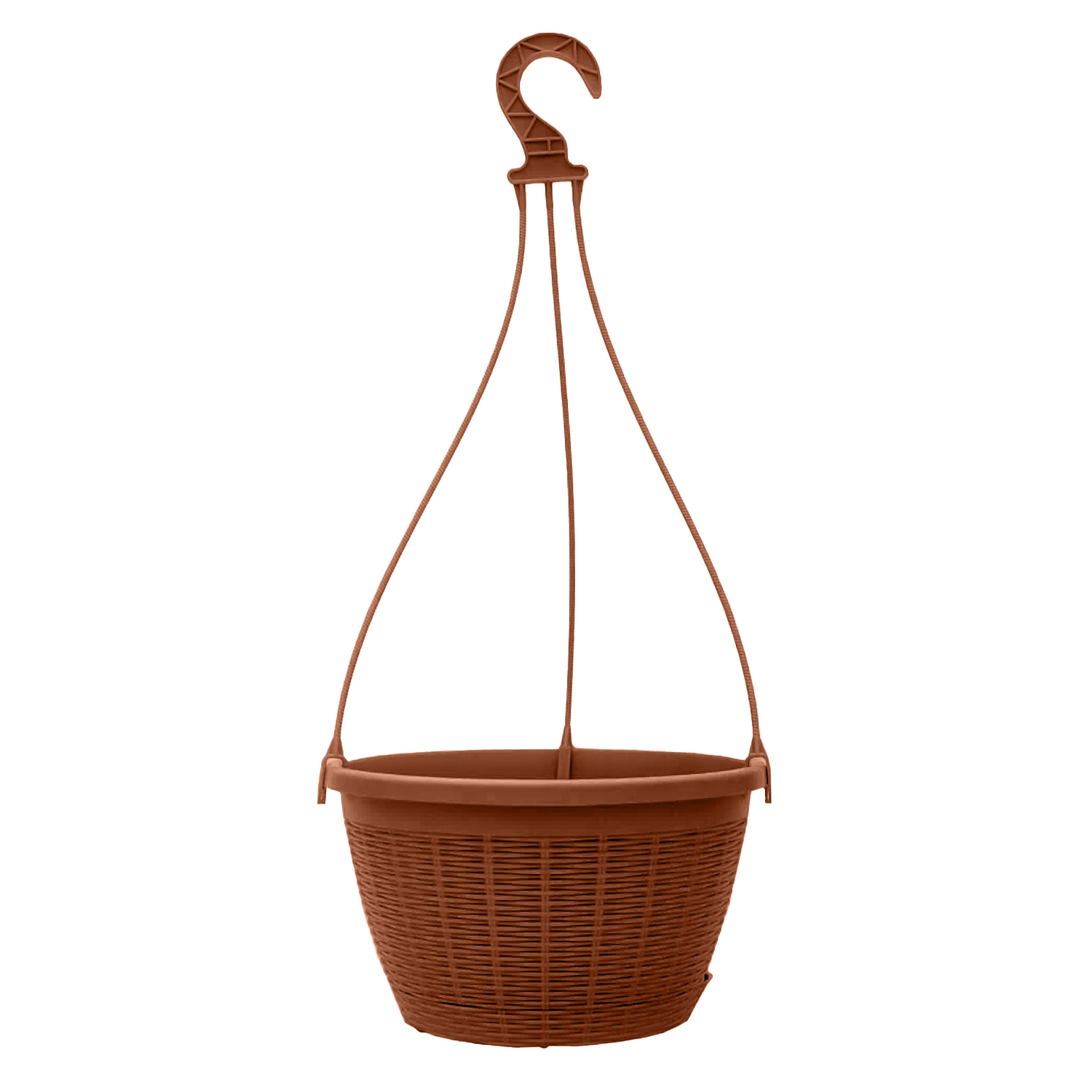 Подвесное кашпо с округлой формой выглядит аккуратно и декоративно. Поверхность украшена рельефом, имитирующим плетение ротанга, благодаря чему изделие напоминает плетеную корзину и добавляет интерьеру уютную фактуру. Конструкция с подвесом позволяет удобно размещать растения на балконе, террасе или в помещении, экономя место. Объем подходит для ампельных и свисающих растений.