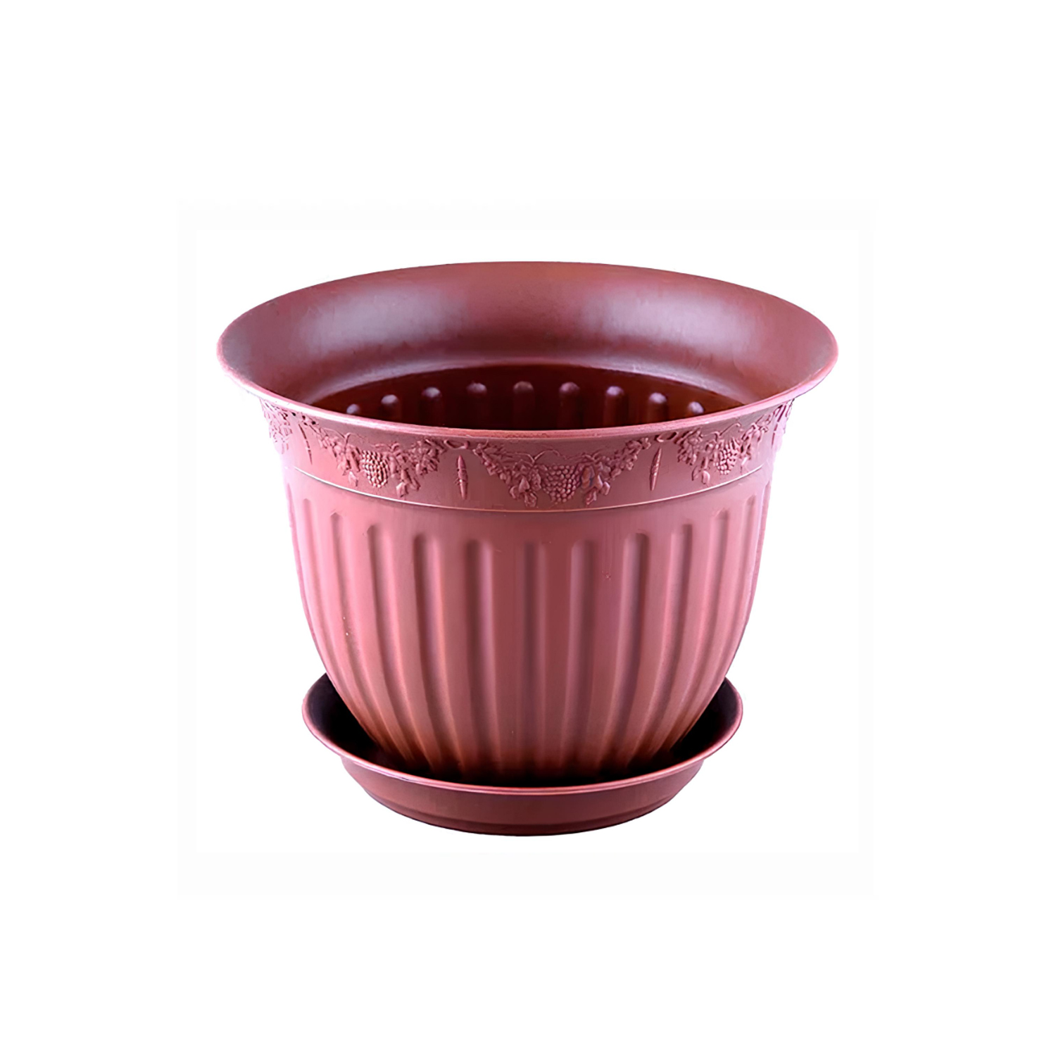 Кашпо «ВИНОГРАД» выполнено в классической округлой форме с аккуратным поддоном. Стенки украшены вертикальным рельефом и ненавязчивым узором винограда, который добавляет фактуру и делает изделие визуально легче. Компактный размер подходит для небольших комнатных растений, укоренения черенков или выращивания рассады.