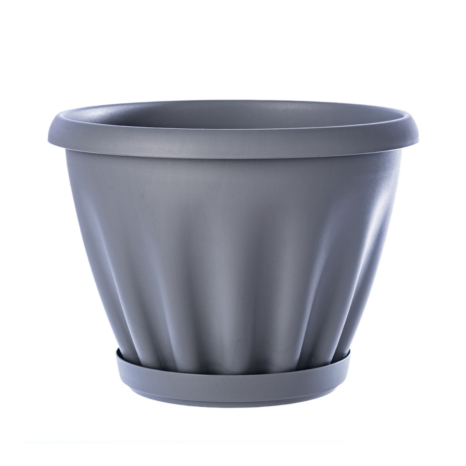 Кашпо с выразительной формой и мягкими вертикальными линиями выглядит аккуратно и основательно, хорошо подходит для дома, балкона или террасы. Серый цвет нейтральный и спокойный, легко сочетается с разными интерьерами и подчеркивает зелень растений. Поддон в комплекте помогает поддерживать чистоту при поливе и делает использование более удобным. Кашпо подходит для средних и крупных комнатных растений, хорошо смотрится как отдельно, так и в группе.