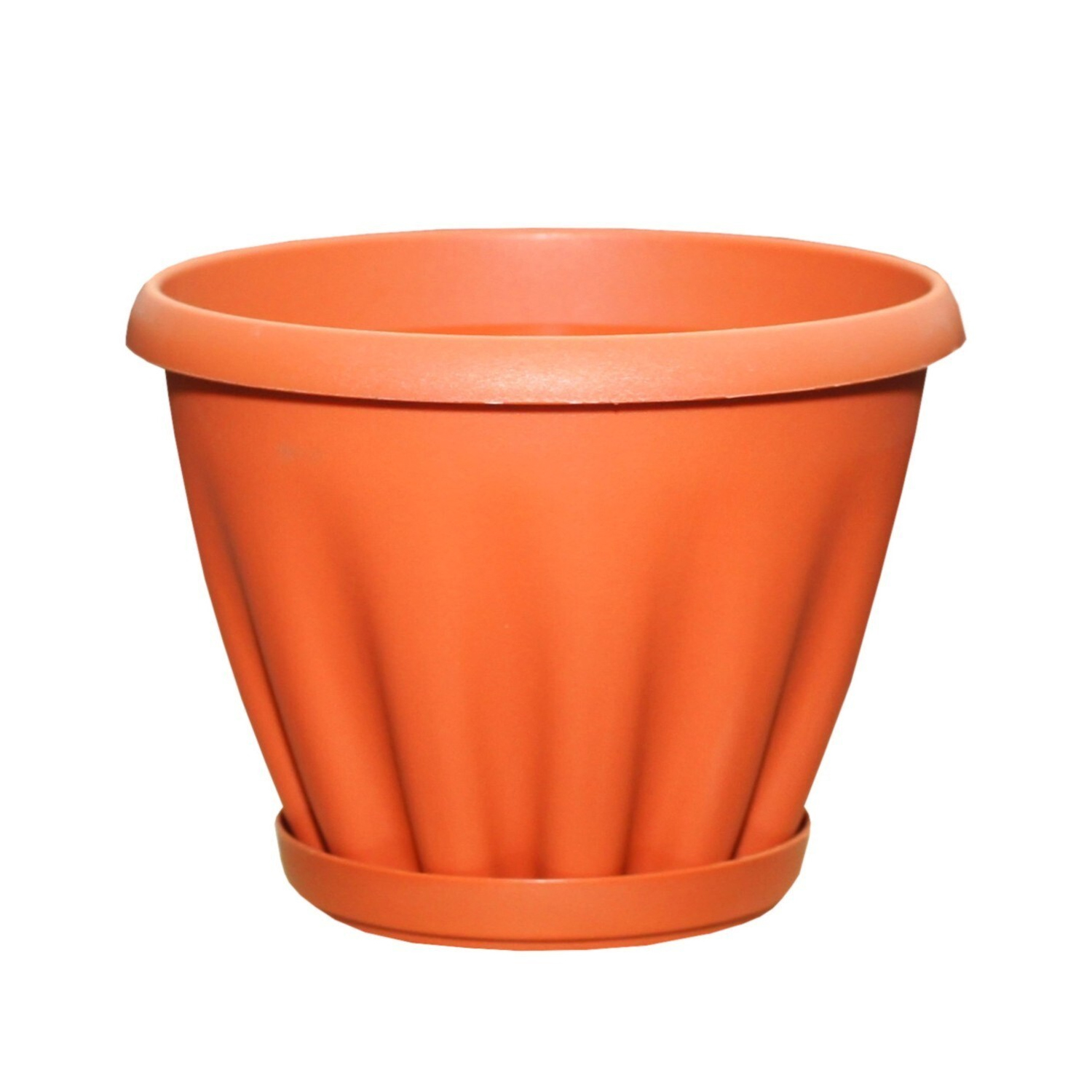 Кашпо с выразительной формой и мягкими вертикальными линиями выглядит аккуратно и основательно, хорошо подходит для дома, балкона или террасы. Терракотовый цвет сочетается с разными интерьерами и подчеркивает зелень растений. Поддон в комплекте помогает поддерживать чистоту при поливе и делает использование более удобным. Кашпо подходит для средних и крупных комнатных растений, хорошо смотрится как отдельно, так и в группе.