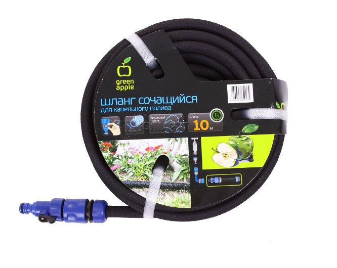 Сочащийся шланг GREEN APPLE предназначен для наземного размещения и позволяет осуществлять равномерный и экономичный полив растений. Снабжен комплектом для подключения и регулятором подачи воды.