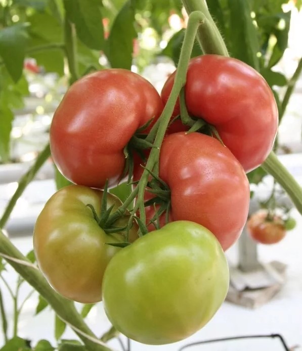 Плодоносить начинает через 90-98 дней после появления всходов. Растение высокорослое высотой 170-180 сантиметров. Первое соцветие закладывается над 11-12 листом, затем они следуют через 3 листа. Кисть короткая, не требует пинцировки, с равномерным наливом крупноплодных томатов. Плоды плоскоокруглой формы, розовые, без зеленого пятна, массой 300-350 граммов, ароматные, сочные и сладкие. Вкусовые качества высокие. Гибрид преимущественно салатного назначения. Ценится за холодостойкость, высокую урожайность, крупноплодность, продолжительный период отдачи урожая. Урожайность 9,8 килограмма с квадратного метра.